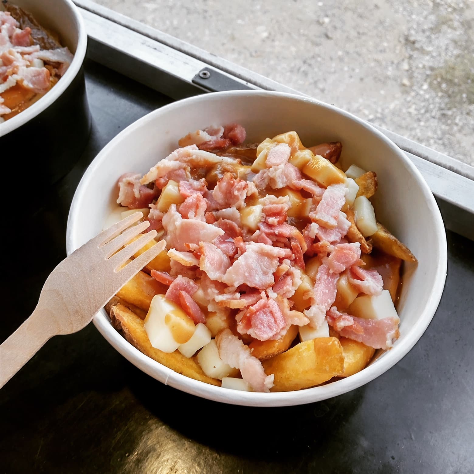 Embarquez pour le Canada ! Dégustez nos délicieuses frites, accompagnées de la légendaire sauce à poutine, de bacon fumé au bois de hêtre savoureux et de fromage filant.