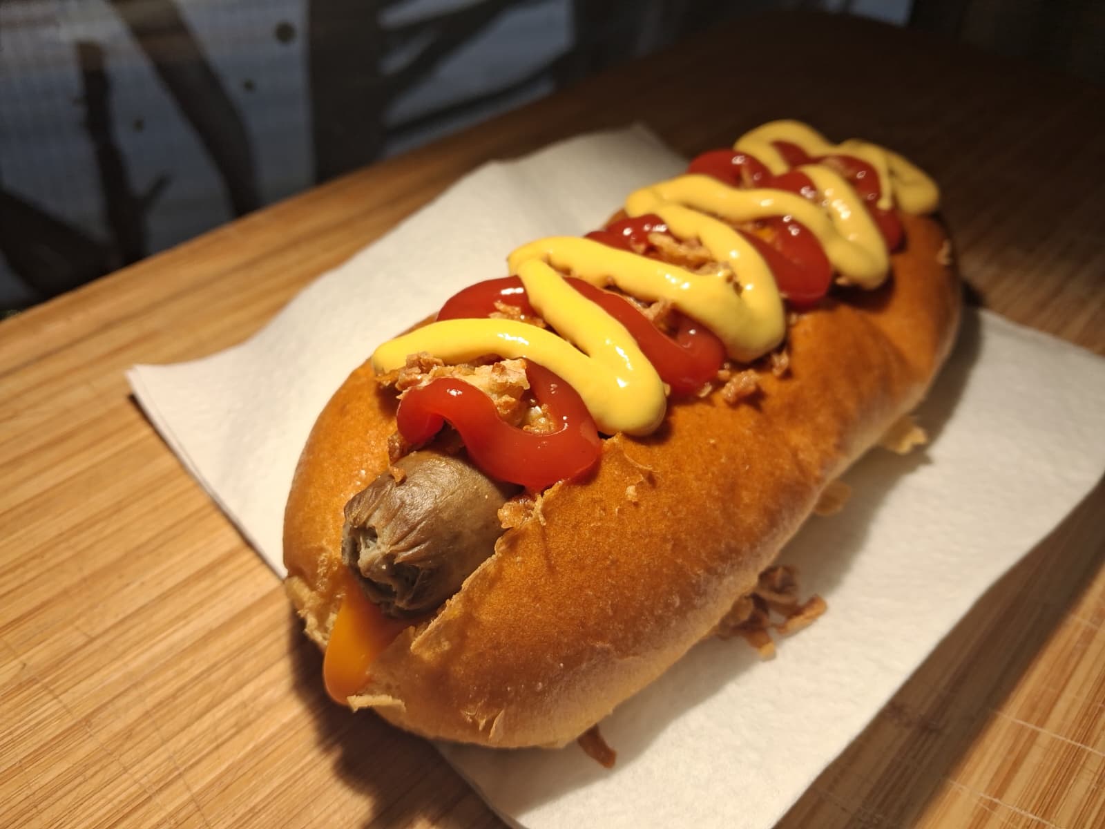Authentique hot-dog américain saucisse de bœuf 100g, pain bun ,cheddar coulant ,oignons crispy et sauce Heinz au choix.